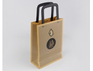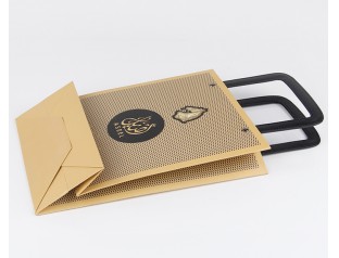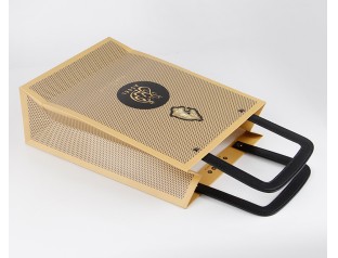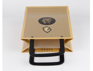 此款紙袋制作采用特種紙,商標燙金,加上PU皮手提繩。手提袋設計的手提處選用了黑色PU皮,高檔紙袋手提繩打雞眼,提高了手提紙袋的承受力。廣州駿業紙袋廠家,專業16年印刷包裝行業,免費設計,量身定制,想了解更多手提紙袋,歡迎致電:020-66677799
