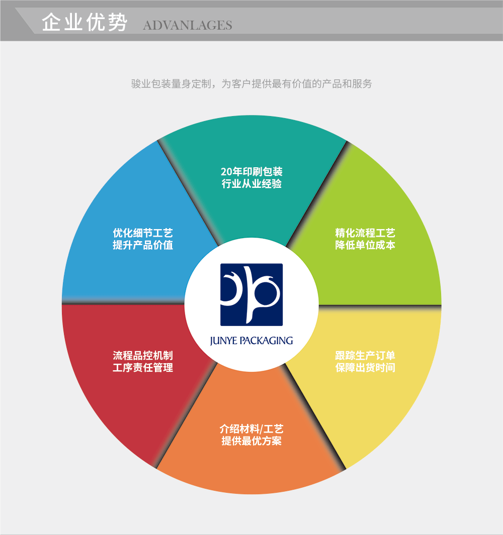 廣州駿業包裝實業有限公司始創于2001年,是一家以印刷包裝制品為主營業務的集設計、生產、銷售為一體的一般納稅企業,主要生產各種精品包裝盒、紙袋、吊牌、束口袋、軟盒(每天產能達到50萬個),其主要應用于服飾、皮具、化妝品、保健品、禮品、首飾、茶葉、酒類、電子產品及其它日用制品等行業。目前公司已加入多個印刷包裝行業互助協會,并通過了ISO9001質量體系認證、德國萊茵認證、BV認證、SGS認證和WCA認證。